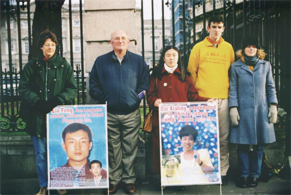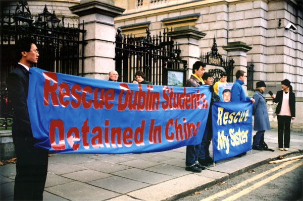 因修炼法轮功被中国阻止返回爱尔兰继续学业的刘锋、杨方两位中国留学生所在的学校也专门派代表来支持。这位丹·理瑞高等学院(Senior College Dun Laoghaire)校长助理Gerard P. Craughwell先生在发言中说,“我们没有政治观点,但作为学生的监护和教育机构,校方希望看到他们的学生重返他们的校园和同学,完成他们的学业,将来改善家庭生计。”这两名在爱留学的法轮功学员,都因为99年回国为法轮功上访被关押过,随后护照被没收,使他们不能返回爱尔兰。今年6月他们都再次得到护照和爱尔兰签证。然而杨方在返爱尔兰登机时被拦截,护照再次被没收。刘锋在取签证前购物时被无理拘捕,至今被关押在大连姚家看守所。不允许任何亲人探视,详情未知。