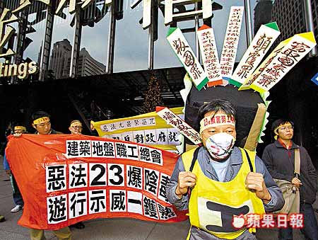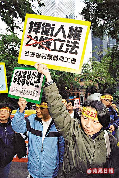 苹果日报2002年12月14日讯:「恶法二十三条吞噬工会权利,天地不容!」代表二十三个工会及三个劳工团体的四十多人,昨于「黑色星期五」游行,抗议政府强行就《基本法》二十三条立法。
