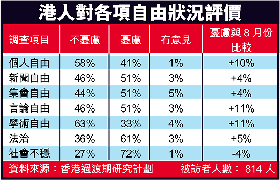 戴高礼指出,调查发现,市民对各项自由忧虑全面报升,尤其在个人,言论及学术三方面忧虑升幅最厉害(见表),当中以管理阶层、专业人士及学生忧虑的升幅最显著,以个人自由为例,担心受影响的商界人士升幅达两成半;学生有一成八,教育工作者则有两成五。
