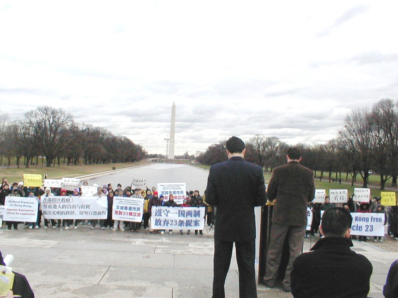 中国民主党无任所大使梯姆.库泊(Tim Cooper)在发言中指着身后的林肯纪念堂说,140多年以前,林肯先生发表废奴宣言,但是奴隶制在今天依然存在,许多国家的领导人对其人民进行精神奴役。现在精神奴役被发展得精益求精,“23条”立法将成为香港街头一支看不见的隐形军队。