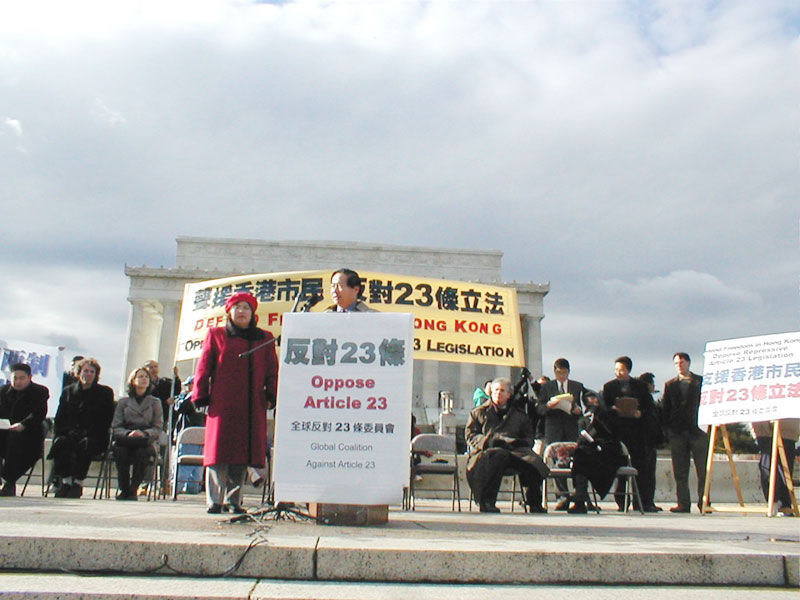 “全球反对23条立法联盟”发言人杰佛瑞.王在发言中指出:“香港特区行政首长不能由全民投票直选产生、香港立法局议席不能全部由民选产生、香港法院终审权又受中国人大常委会‘释法’凌驾,在这个不民主的政治环境下,政府缺乏有效监督,特区政府匆匆就基本法第23条立法将严重威胁到香港社会思想、信仰、新闻、言论、文化创作、资讯、学术研究、结社等各种自由,从根本上令香港社会‘一国两制’名存实亡。” “第二十三条立法的实质要害在于,中共极权者通过所谓法律手段将其侵害人权自由、打压法轮功及其它和平团体的暴政向香港延伸。如果香港政府与民众任其在立法问题上打开缺口,不单法轮功会受到打击,昔日以自由开放著称的‘东方之珠’香港会变的与专制下的中国大陆并无两样。”