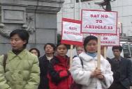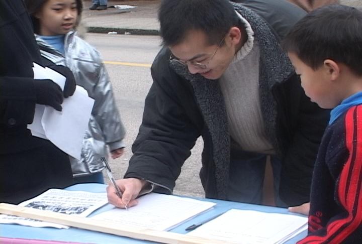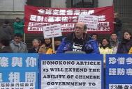 法轮功学员代表海伦用粤语发表声明:“香港政府今年重提第23条立法,十分明显的是受迫于中央江氏政权的压力,想把[在内地]对法轮功学员的迫害延伸至香港。首当其冲受到影响的虽然是法轮功学员,然而实际上所有600多万香港市民、甚至包括已经移民到加拿大的居民,他们的切身利益都会受到影响牵连……”她表示不希望象同伴张天啸一家所经历的、因大陆对法轮功的迫害导致的家庭悲剧在香港出现,“我们(法轮功学员)呼吁所有关心香港未来命运的人们,在倡议书上签名,一起要求加拿大政府督促港府停止23条立法。”