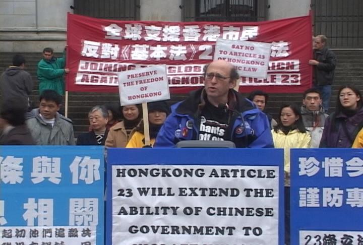 BC省医院雇员工会主席弗莱德-慕莘(Fred Muzin)表示:“目前在香港发生的事情十分重要,全世界的人都应该给予关注,因为香港第23条立法,即所谓的反颠覆法,企图把在中国大陆实行的严苛峻法输出到香港,那么中国[江氏]政府都试图把它的一些举动,象对法轮功学员的迫害、对工会成员的迫害等等,扩张到中国边界之外,因此所有人都应该关心。”