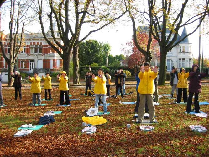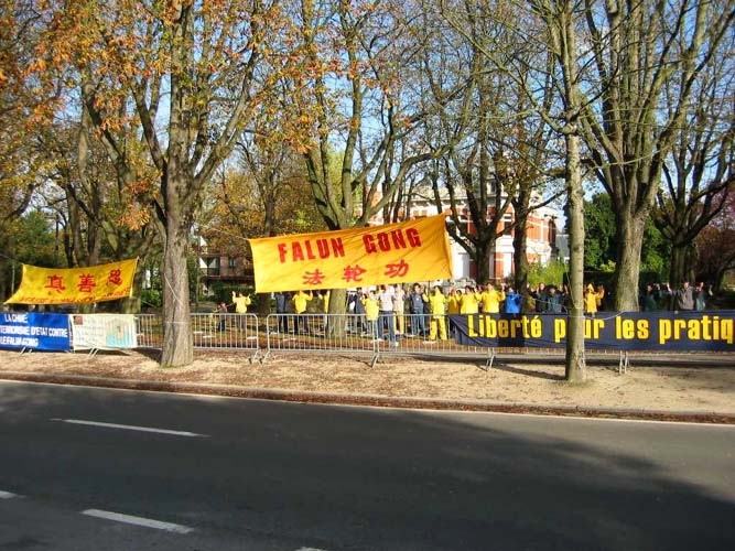 【明慧网2002年12月17日】2002年10月26日欧洲各国弟子早晨9:00来到中国驻比利时大使馆前发正念。与此同时学员开着一辆挂有“停止