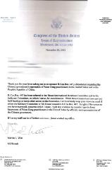 感谢你写信要求我针对中国[江氏]政府对美国及中国的法轮功修炼者的迫害,联合发起447号决议(H.Con.Res.447)。
