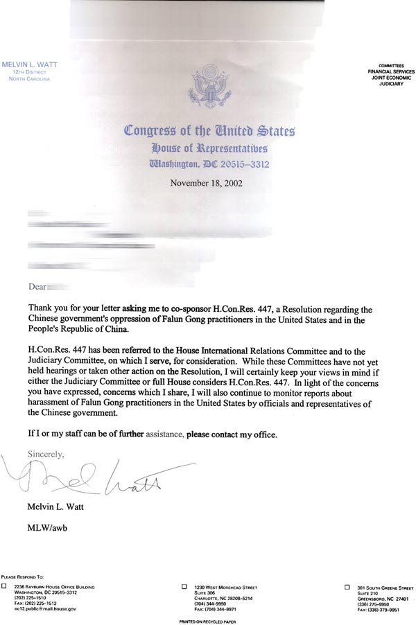 447号决议已经被提交到众议院国际关系委员会,以及司法委员会作审阅,我是司法委员会成员。尽管委员会还未就此举行听证会或采取任何其他行动,如果司法委员会或全体众议院审阅447号决议时,我一定会记住你的观点。就你所表达的担忧,我也有同感,我也将继续审视有关中国[江氏]政府的官员和代表在美国对法轮功修炼者进行骚扰的报告。