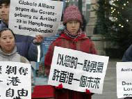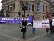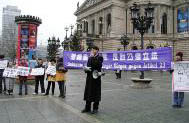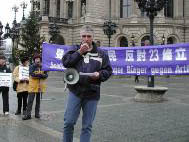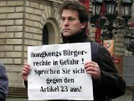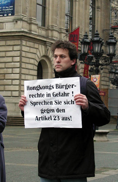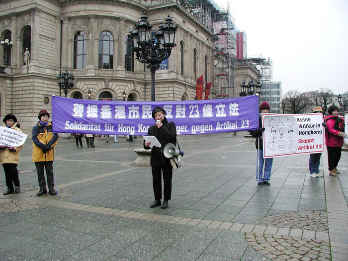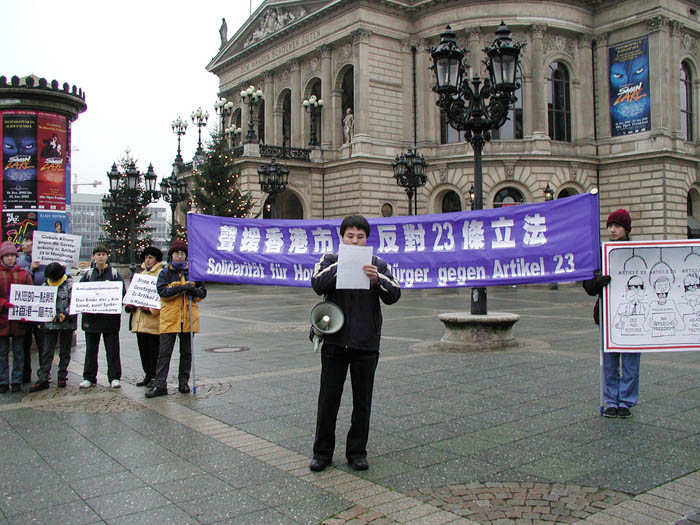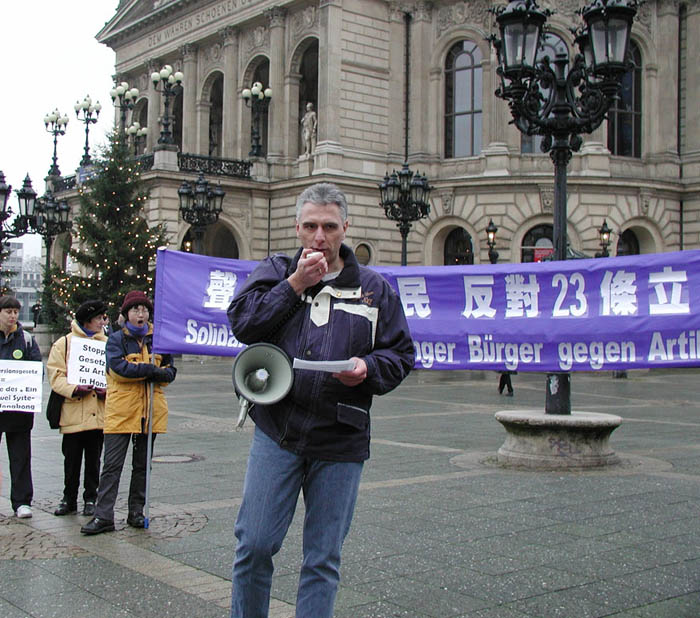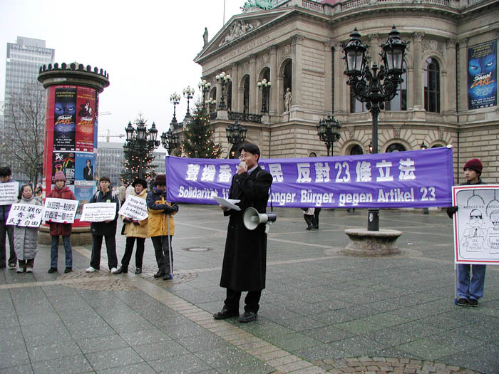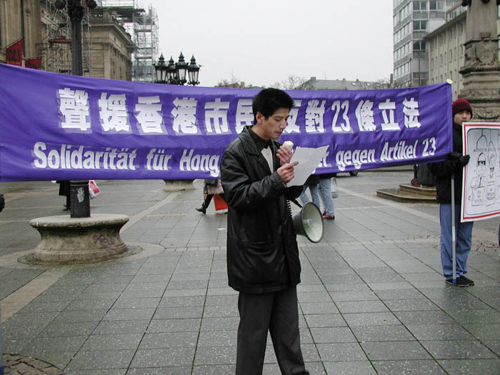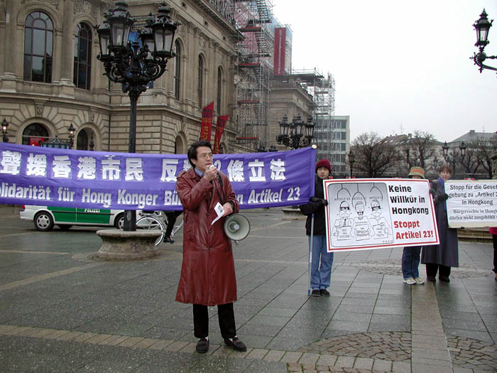 | “香港的人权在受到威胁!让我们共同发出我们反对23条立法的呼声。” | Kasten Noell 宣读法轮功之友反对23条立法的声明 | 王徐宣读全德学生学者联合会反对23条立法的声明 |