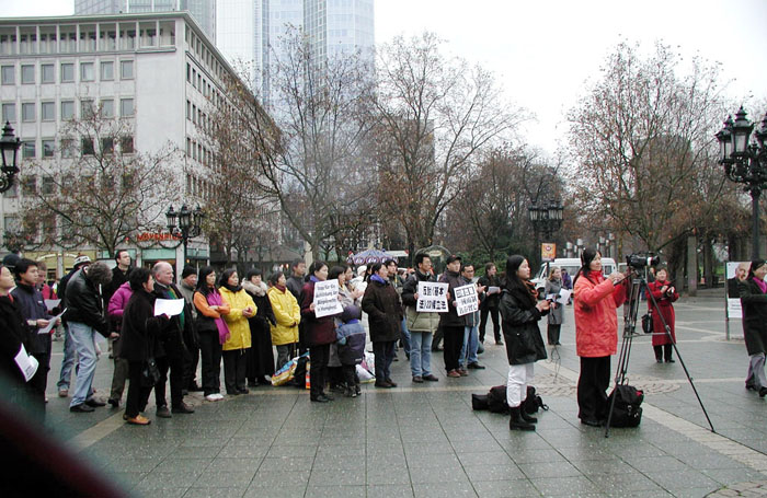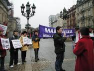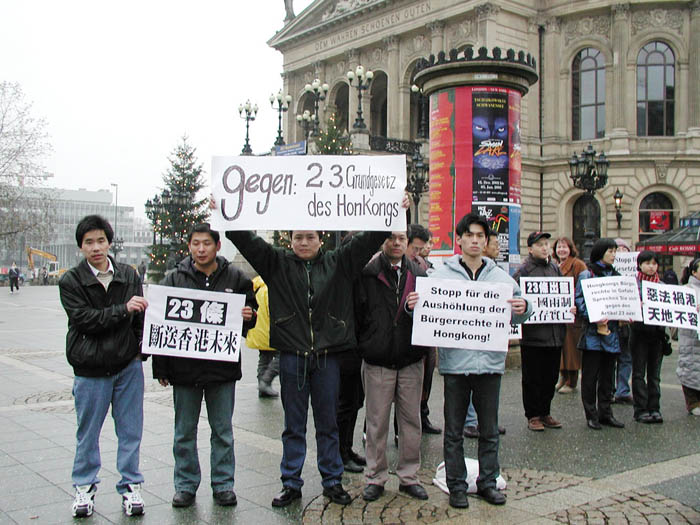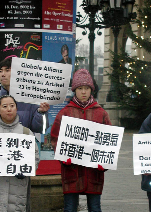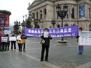 | 前全德学生学者联合会主席,「德国导报」及「莱茵通讯」主编钱跃君先生介绍香港基本法23条的由来及23条立法的危害 | 集会者告诉德国公众23条立法对香港民主自由的危害,表示坚决反对23条。 | 中德语言文化交流协会主席郑亚文女士宣读全球反对23条联盟欧洲同盟联合声明 |