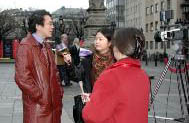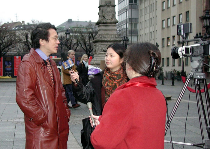 | 公众专注地聆听到会团体的演讲 | 新!唐!人:电视台德国记者站采访钱跃君先生 | 德国慕尼黑大学学生陈刚讲述他自己因修炼法轮功而被中国大使馆拒绝延长护照以及他年老的母亲因修炼法轮功而在中国遭受迫害的真实故事。他告诫人们共同起来反对23条立法,因为我们中任何人都不希望如此残酷的对善良民众的迫害同样在香港发生 |