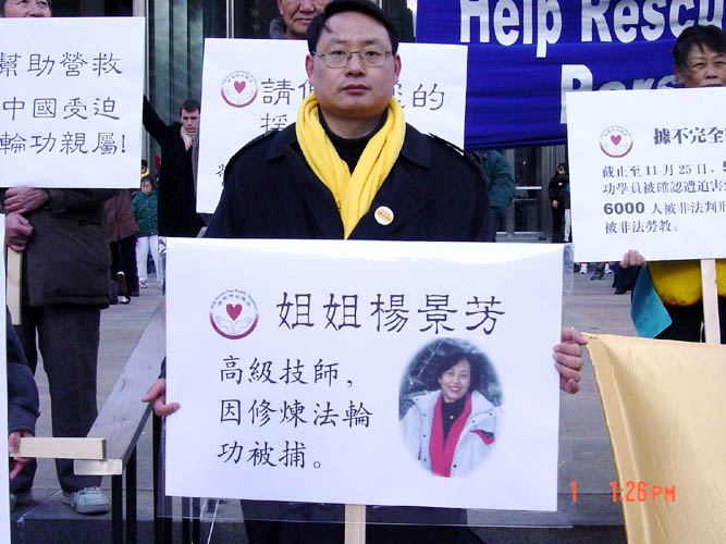 被迫害亲人家属、费城托玛斯.杰佛逊医院杨景端医生讲述了他姐姐杨景芳一个月前被国内警察秘密绑架,至今下落不明的情况, 并代表所有被迫害的法轮功学员家属向媒体和公众呼吁“请帮助营救我们的亲人”。