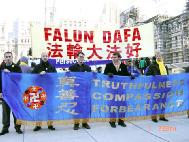 下午2点,法轮功学员打着“请帮助营救我们在中国的亲人”的大型横幅从市政大楼前出发,走过中国城。走在步行队伍最前面的是几十名在中国被迫害的法轮功学员的家属,他们胸前佩戴“请帮助营救我们的亲人”的绸带、向民众发出呼声。被迫害的亲人的姓名及照片,迫害的统计数据,以及“请您伸出援手,营救我们的亲人”的小展板在步行队伍中向人们展示江氏对法轮功学员迫害的这一不容置疑的事实。
