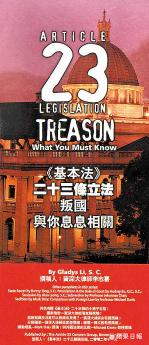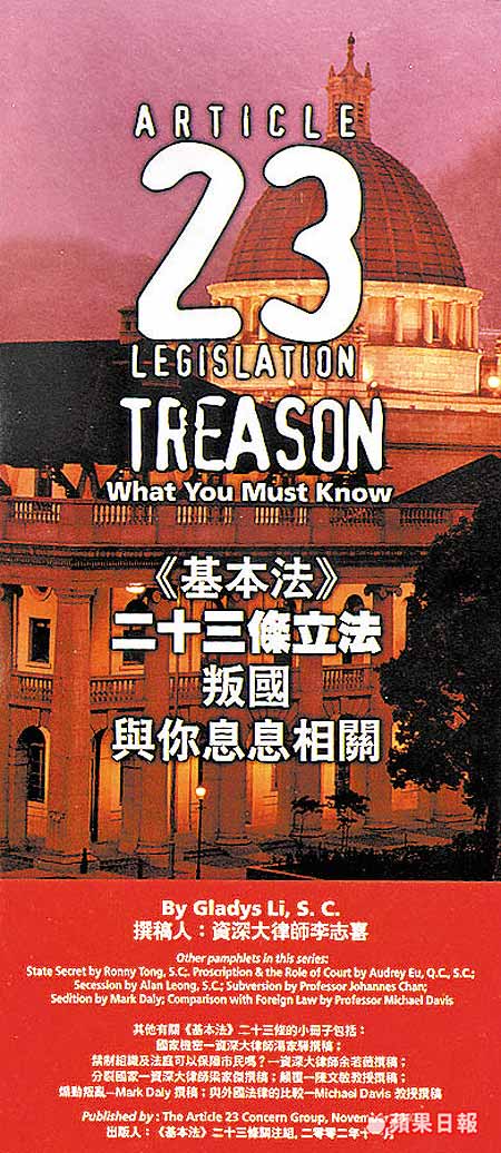 前言:[香港]政府官员一再强调《基本法》二十三条立法,只是规限一些普通市民不会触犯的高层次罪行;但一群大律师却挺身而出,亲自撰文戳破政府的谎言。本报由今日起逐一向读者撮要报道。资深大律师李志喜撰写小册子:《叛国与你息息相关》(图),提出下列质疑: