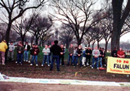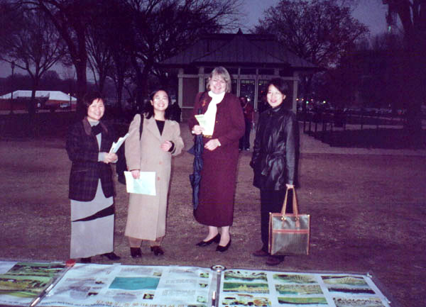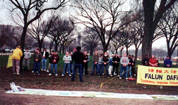 DC的功友知道这个消息后,到了这一天不约而同地赶来帮忙,我也在见面的前一天晚上意外买到了一件非常端庄的在户外穿的合适的外套。那天早上,天气不太好,博物馆还下了一点雨,但我们一去就发正念,天虽然有点阴,就是不下雨,炼完四套功下来,觉得天色还好了点。4点多时,开始了我们意想不到的精彩的一幕。先是两个过路的学生过来跟我们炼功,炼完后他们说:原先以为是一般的气功,炼一下觉得不一样呀,能量真强,于是我鼓励他接着再炼,同时邀请他的另几位朋友也来试试,三个、四个、一些父母也积极鼓励他们孩子来炼,后来他们老师带着一群学生来了,叫他们的学生都来炼。呵,真壮观,至少四十几位学生和老师站在展板前学炼法轮功,其中一个小孩大约只有三四岁,却从头炼到尾,毫不示弱,每一位下班赶来炼功的同修都乐了,“真好,真是佛光普照,礼义圆明呀”,过往的中国代表团也不时地回头看着,太没想到了,法轮功在海外是这么地受到欢迎,有人转了几圈,还是回来看我们的展板。