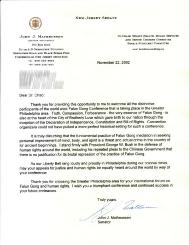 然而,寻求个人身心提高的法轮功修炼功法却在其发源地[中国]被视为一种威胁和犯罪,这的确令人非常不安。我坚决支持乔治-布什总统在世界范围内捍卫人权的行动,包括他对中国政府的再三呼吁:对于法轮功的残酷迫害是毫无道理可言的。
