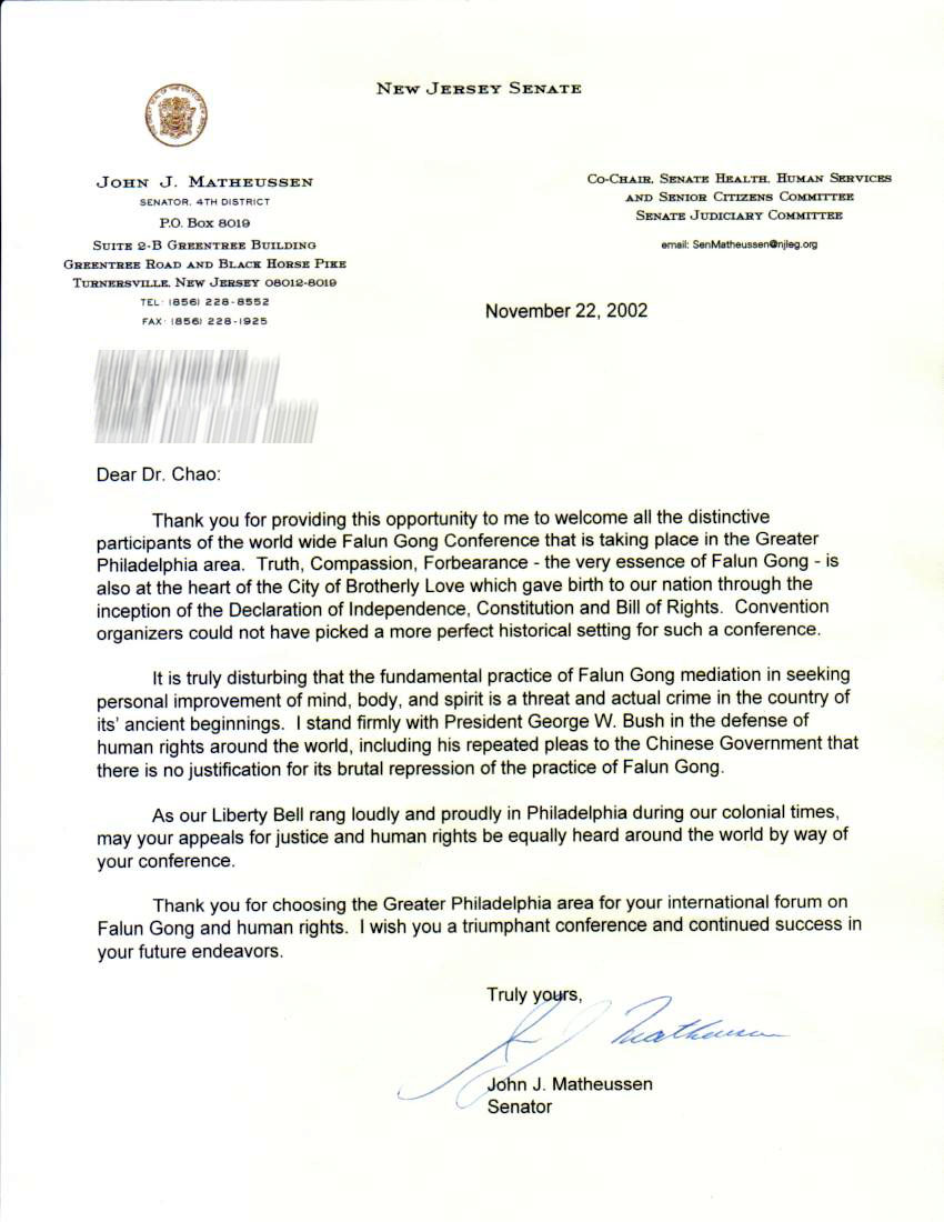再一次感谢你们选择大费城地区召开法轮功和人权国际会议。祝愿大会圆满成功,并祝你们今后的努力不断取得成功。
