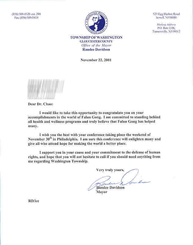 【明慧网2002年12月6日】新泽西州华盛顿镇市长致信法轮功学员表达对费城法轮功交流会的美好祝愿和对法轮功的一贯支持,全文如下: