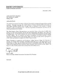 爱默蕾大学学生会协同莫豪斯(MOREHOUSE)学院、斯培尔门(SPELMAN)学院、乔治亚州大学和乔治亚州州立大学的学生,恳请阁下作为美国在中国的代表,敦促中国政府立即释放周雪菲女士。感谢您将我们的信带往劳教所,并请向周雪菲女士转达我们的关爱。我们盼望周雪菲女士能够在节日到来之前和家人团聚。