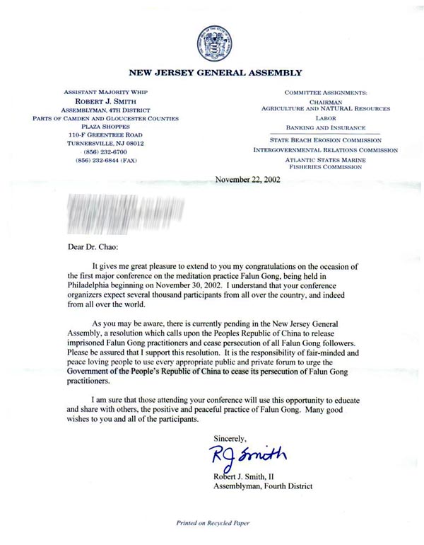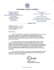 您可能了解,目前在新泽西州议会正在讨论一个要求中华人民共和国释放被监禁的法轮功学员并停止迫害法轮功学员的决议。请放心,我支持这个决议。正义和爱好和平的人们有责任利用每一个适当的公开和私下场合敦促中华人民共和国政府停止迫害法轮功学员。