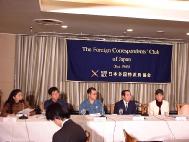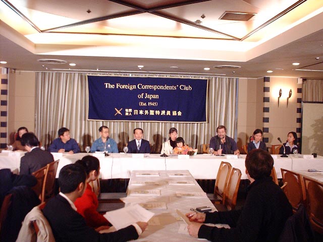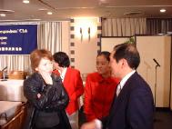 | 澳洲法轮功学员戴志珍 | 日本法轮功学员发言 | 招待会后,记者围住发言人继续采访 |
