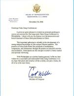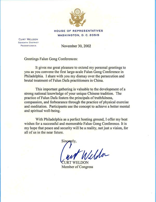 值逢你们在费城召开首次大型法轮功心得交流会之际,我非常愉快地向你们表达我个人的祝贺,对于在中国的法轮功学员受到的迫害和残酷虐待,我同你们一样感到震惊。
