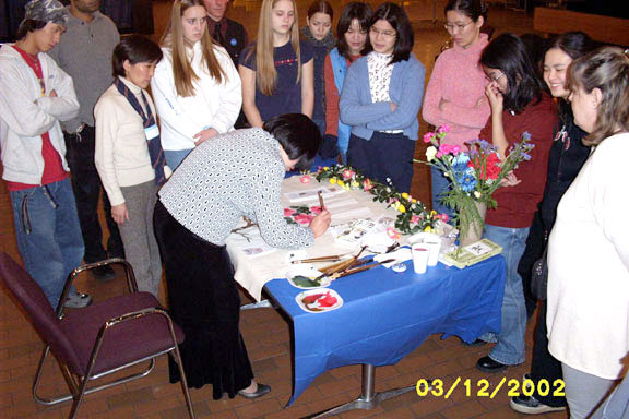 | 画家当场为参观者作画 | 高中生观看大法真相录像 | 画家与前来参观的学生合影 |