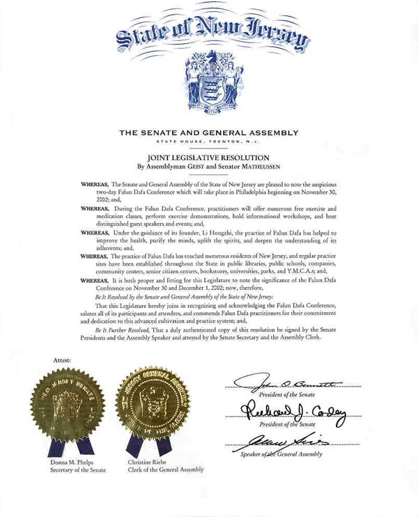 鉴于,新泽西州参众两院高兴地获悉为期两天吉祥的法轮大法心得交流会将于2002年11月30日在费城召开;