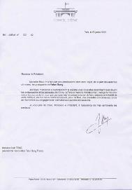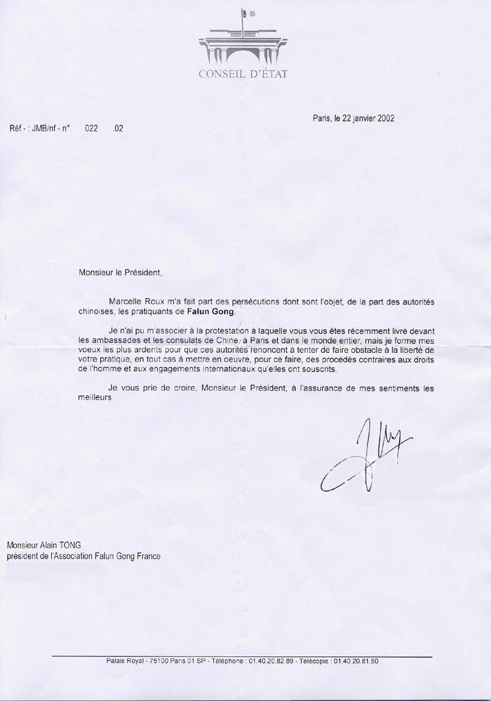我未能参加你们最近在中国大使馆、及巴黎领事部前以及在全世界举行的抗议活动,但是,我发出最强烈的心愿,以使中国当局停止图谋对你们修炼自由的阻挠、停止为此而做出的有悖于人权及它们所签署的国际公约的举动。