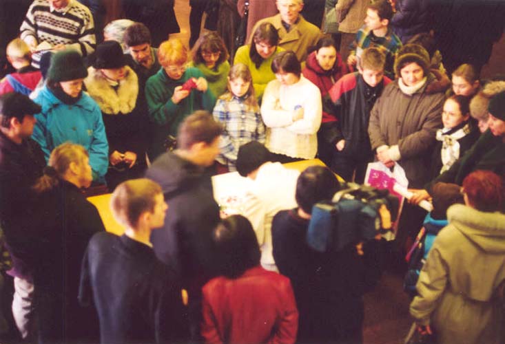 【明慧网2002年2月1日】我们圆满结束了乌克兰(Ukraine)首都基辅(kiev)的画展后,来到了乌克兰的另一城市那普佩脱斯基(Dnepropetrovsk)。俄罗斯学员联系了当地的政府,并得到政府的大力支持。政府提供了位于市中心马克思大街上─该市最大的博物馆给我们免费办“营救受迫害的法轮功学员的义展义卖画展”讲真相。