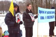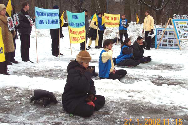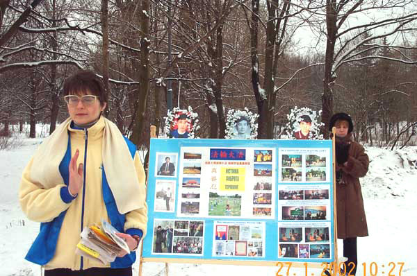 【明慧网2002年2月1日】2002年1月27日,圣彼得堡大法弟子来到莫斯科,与莫斯科大法弟子汇合后一起来到中国大使馆进行和平抗议活动。学员们打开写有“要求中国政府停止对法轮功学员的非法镇压”和“停止在俄罗斯对法轮功的造谣活动”的横幅,抗议期间学员们手里举着被中国当局折磨致死的同修们的照片。