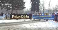 一百多位法轮功学员身著黄色夹克,或披着绣有真善忍字样的黄色围巾,在队伍最后全程参加游行活动,并在数个定点现场炼功,受到围观民众鼓掌欢迎。