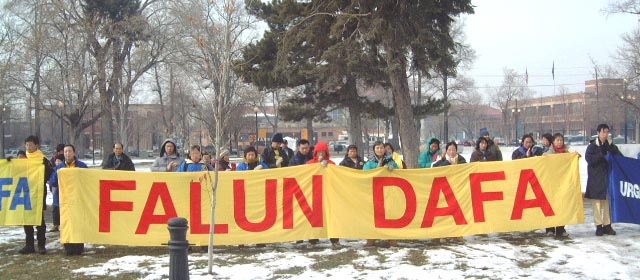 图:中国法轮功学员2月7日在盐湖城2002年冬季奥运期间的一次集会中打坐炼功。学员在星期四说集会是想告诉世界法轮功好,同时使人关注在中国法轮功学员遭受的残酷迫害。 (路透社/David Loh)