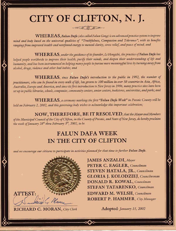 为此,新泽西州,帕塞克县,克里夫顿市(City of Clifton)市长和全体市议员宣布2002年1月28日至2月3日为克里夫顿市:
