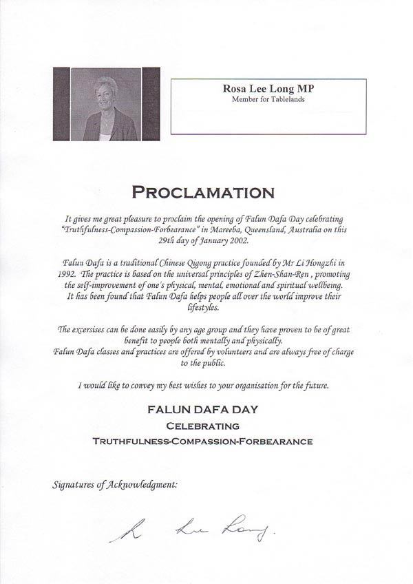 里隆女士认真听取了我们的介绍,并以极大的兴趣观看了“正法之路”图片展及其他大法图片。她还观看了功法演示,并长时间与学员交谈。当她了解到中国江氏流氓集团对无辜法轮功学员的残酷镇压情况后,立刻毫不犹豫地表示要在请愿书上签名。我们为市长、议员及其他各界要人准备了特殊的请愿书,这是我们在北昆士兰的旅程中第一次遇到政府官员主动要求签署请愿书。