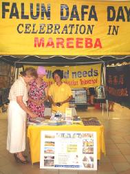 商业中心内,人流不息,很多人止步索取资料和观看功法演示。只要有机会,我们就向人们介绍法轮大法在中国遭受迫害的真实情况。几乎所有听到我们介绍的人都在请愿书上签了名,还有很多人问是否会在马利巴建立炼功点。我们把离马利巴开车一小时的凯恩斯市炼功点介绍给他们,并告诉他们法轮大法之友已向当地图书馆赠送了《转法轮》和《法轮功》两本书,以及教功录像带。