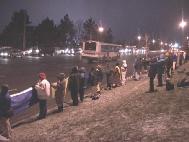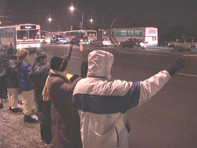 下午请愿刚刚开始时,学员队形旁边曾经有好几辆警车,看得出警察开始是相当紧张。甚至有警察询问我们学员有没有汽油、绳子什么的。学员知道他们是受了邪恶宣传造谣的影响,没有抱怨或不平,而是耐心地讲真相。渐渐地警察明白了真相,和学员的气氛祥和了。到后来,学员听到一个警察对他的同行说,“他们那个团体自己知道怎么做。”不论邪恶造了什么谣,在大法弟子纯正的一切面前又一次被轻而易举地粉碎了。