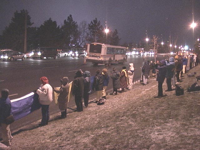 我们来到奥运会不是抗议或反对什么,甚至不是为了向世人讲述我们伟大师尊和同修为救度众生所承受的种种苦难。让更多世人了解法轮大法的真相、奠定未来生命的美好是我们的心愿。这次请愿,学员们直接面对的是犹他州和来自世界各地的代表团和新闻媒体,间接面对的是世界几十个国家的几十亿人民。学员在各国代表团车辆必经的路旁打出各式横幅,在积留着残雪的土坡地上排出英文法轮大法(FALUN DAFA)字样。为保持队形,许多学员十余小时下来中间没吃上一口饭。在路边举横幅的学员几个小时没有替换,可是看到过往的公共汽车经过时,一位举横幅的阿姨对同伴说:“举高点吧,有的车窗高啊。”