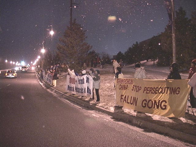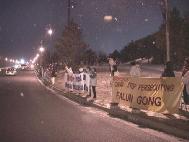 或许是因为看到学员们近日来散发的大法材料而对大法有了一定的了解,或许是被学员们近十个小时的无声的展示而感动,晚十点过后,当开幕式结束,各国代表团离开会场时,看到路边的横幅、烛光,漫天飞舞的鹅毛大雪和面带微笑向他们招手的学员,来自不同国度、不同种族的运动员们纷纷做着各自祝福的手势,向这一群默默的男女老少表达自己的敬意,有不少人喊:“祝福你们!”“我们支持你们!”车辆则轻声鸣笛以示支持。学员们一直等到午夜十二点钟各代表团都离去以后才结束请愿。