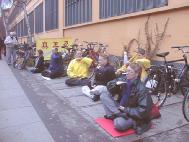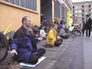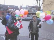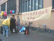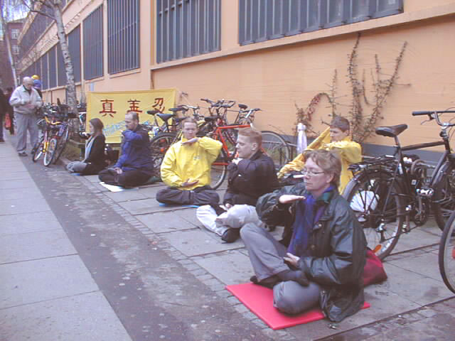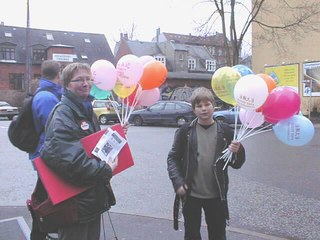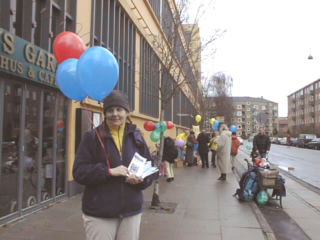 上午蒙蒙细雨中,丹麦大法弟子已开始在文艺表演举办地阿玛商业中心门外炼功,派发宣传品。还有很多丹麦青年帮助送发印有中英文“法轮大法”、“真善忍”的氢气球。在举办纪念会的会场内外,商场上下,整个地区,大人小孩都拿着氢气球。“法轮大法好”飘荡在整个地区。丹麦大法弟子在寒风中坚持一整天,直到天黑才结束。