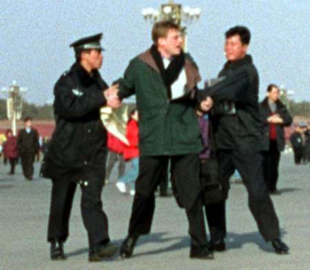 2002年2月11日中国新年除夕,当纽约法轮功学员李伟.布莱迪和加拿大法轮功学员杰森.劳福特斯(不在图片内)在北京天安门广场发起抗议时,中国警察拘捕了他们。目击者说两名法轮功学员展开一面黄色的横幅并用中文高声呼喊“法轮功好”等口号。(路透社/Str)
