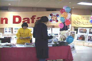 一位老华侨对江集团对法轮功的迫害非常气愤,他告诉我们,他还给当地华人报纸写过一篇文章,谴责中国当权者对法轮功的迫害。还有几个中国人告诉我们,他们以前看过法轮大法的书籍,觉得很好,但是后来因为种种原因,没有坚持修炼。看到我们的展览后,随即向我们询问如何学炼。一位加拿大人观看我们的图片展时,“带把的鸡蛋”这张照片,深深的吸引了他。一位学员用英语向他讲述了这个神奇的故事。听过后,他深深的感叹:“真是奇迹!”一位中老年妇人,来到我们的展位时,高兴地说:“法轮大法,正是我要找的。”她向我们打听如何学炼,看过展览的全部图片后,她带走了一份免费中文资料和一套录像带,等到活动快结束时,她又回到我们的展位,告诉我们,她已经将真相资料送给了她的一个朋友,她还想再拿一些回去,带给其他的朋友,我们又为她挑选了多套真相资料和录像带,她才满意地离开了。