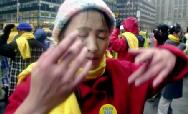 (图片二)2002年1月31日,星期四,法轮功及其支持者们在纽约世界经济论坛会场华尔道夫大饭店附近聚集,图为法轮功学员易蓉在炼功。法轮功在中国被禁。