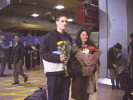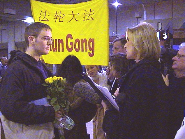 我们到达希斯罗机场后,由于我们的座位在最后,所以最后一个出关。英国功友手持鲜花迎接我们。多家媒体现场对我们进行采访,他们包括:来自路透社、BBC、来自Daily Mail的及大.纪.元;报的记者。三名录像师和一名法轮功学员录下了45分钟的现场采访。后续的电视和电台采访也同时敲定。