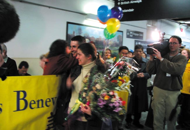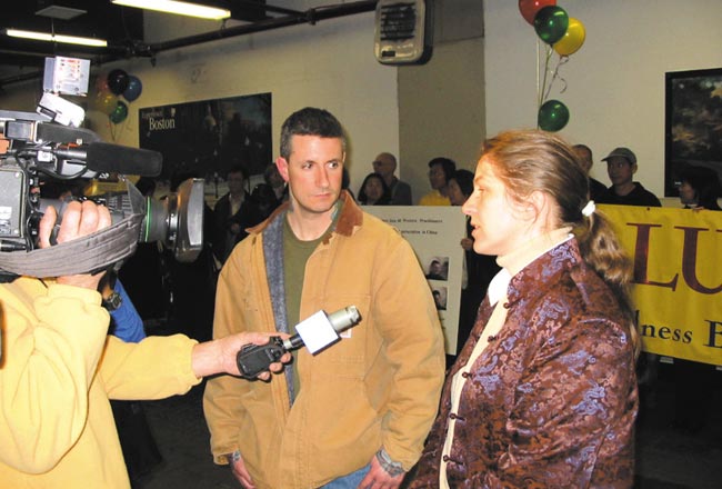 两名大波士顿地区的西裔法轮功学员──瑞欧顿·盖洛乔(Riordon Galluccio)和玛瑞亚·邵子曼(Maria Salzman),在天安门广场请愿后于2月16日午时到达波士顿Logan机场,受到当地50余名大法弟子的热烈欢迎并接受各大电视台CBS、ABC、NBC、FOX的记者现场采访。
