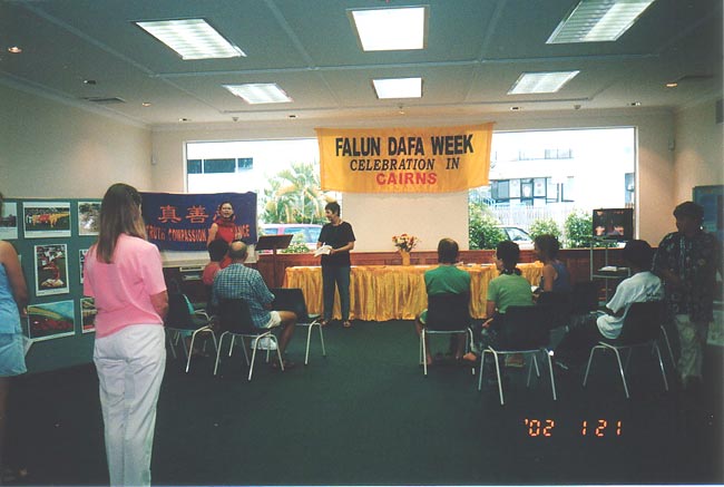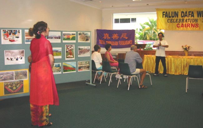 图书馆外边的学员不顾烈日当头,热情地邀请人们观看图片展。由于他们的努力,人们鱼贯而入,络绎不绝,很多人观看了功法演示的录像带,有几个人干脆留下不走,等着跟学员学功。凯恩斯市有一个活跃的炼功点,周末学员还去市场洪法。我们介绍这些感兴趣的人与当地学员联系。