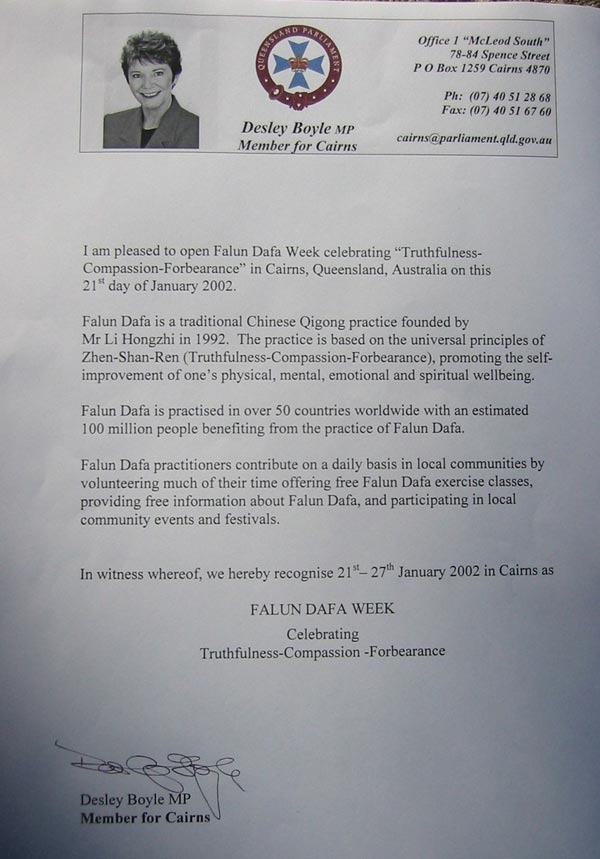 稍过10点半,我们的贵宾,省议员戴斯蕾.波尔女士到场,并庄重宣布凯恩斯市“法轮大法周”开幕。戴斯蕾.波尔女士热情地欢迎所有在座的与会者,并宣布她对法轮大法及真善忍法理的热情支持。她观看了学员的功法演示,并认真地观看了图片展及其他资料。为了表示对法轮大法的支持,戴斯蕾. 波尔女士欣然在“法轮大法周”的公告上签字。典礼后,人们小用茶点,继续观看图片展,索取资料。
