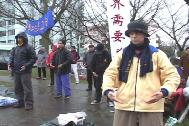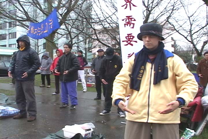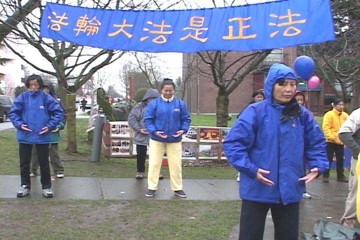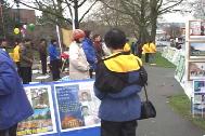正月初六星期日(2月17日),温哥华每年一度的华人社团大游行在中国城举行。法轮功学员们也一早来到这里悬挂彩旗,横幅,彩球和小学员自制的法轮风车,讲清真相的大展板沿街道一字排开,电视机也设立在街头醒目的地方。络绎不绝的行人似乎为今天了解真相而来,不时停留,伫立观望,从那迟疑,徘徊,迷茫的目光中,读得出那心灵深处的撞击。这时天淅淅沥沥地下起了小雨,学员们在雨中炼功打坐发正念,沉浸在祥和宁静中。这种祥和宁静波及开来,好象定住了周围的一切,两个多小时过去了,雨越下越大,行人只好停留在街道对面店铺房檐下观看,成为真正的观众;许多西方人士伫立在雨中已似乎忘记了来此地的原因。人们有序地排队索取真相资料,来参加中国城游行的省长排在索取资料的人群中,有幸地拿到了那位学员手中的最后一份资料。爱思索的人们向学员提出一连串的问题,几百份真相资料光盘在短短时间内发放一空。这就是佛光普照,法的威力。