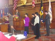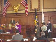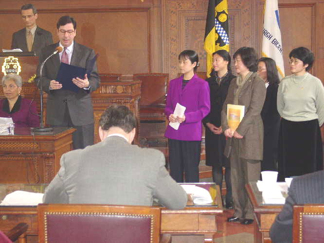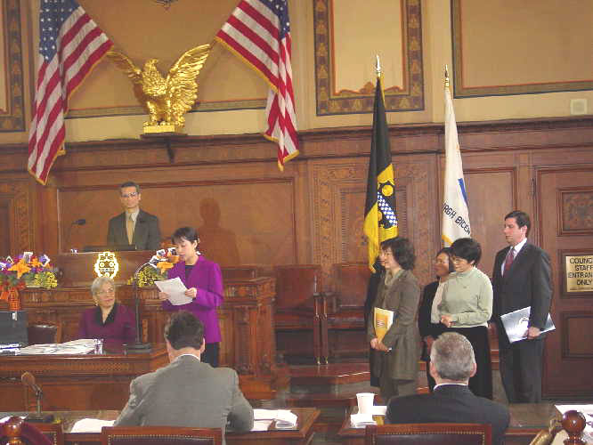 2月19日上午颁发仪式的会场庄严肃穆,决议发起人,市议员威廉.佩督图在仪式上正式宣读了议会决议后,法轮功学员发言向市议会致诚挚感谢并对中国目前仍在进行的无理疯狂迫害做了进一步的揭露。之后决议发起议员威廉.佩督图又再次发言,向其他在场议会成员及听众说明了在中国对于法轮功学员的多起虐杀行为也同样发生在了匹兹堡市的姐妹城市 -- 湖北省武汉市,他说道,“我理解姐妹城市的精神,但是基于人性的立场,我提议将我们今天的决议同时寄往武汉市,以此来表明我们对于此事件的态度。”此一提议被立即当场通过。