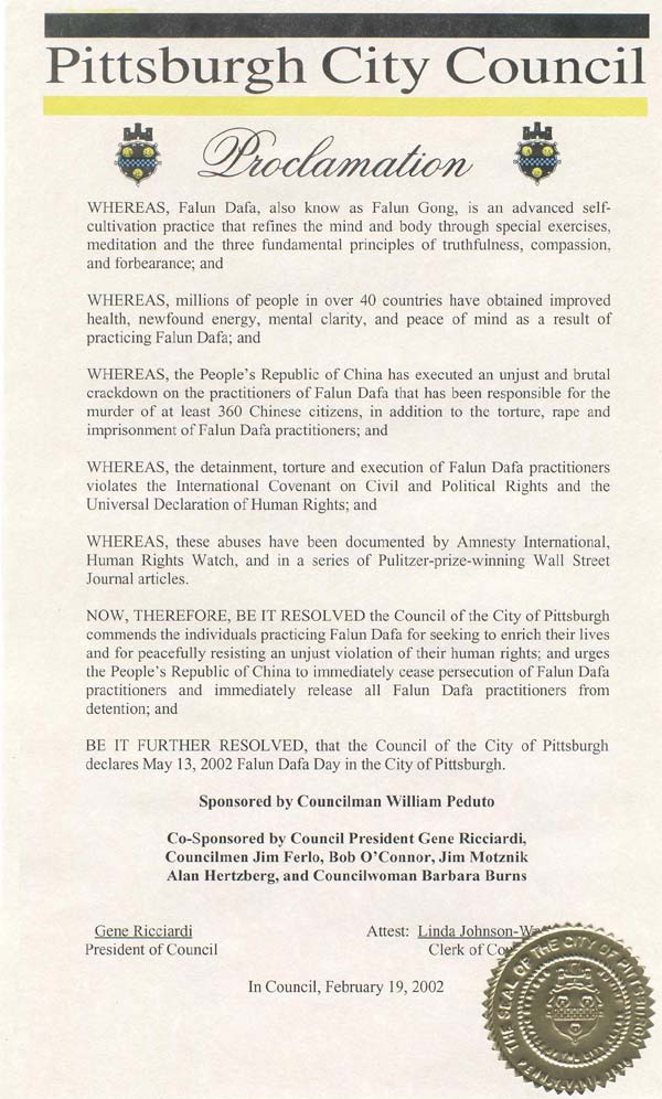 现在,依照此决议,匹兹堡市议会表彰那些寻求丰富他们生命,采用和平方式抵制不公正的人权侵害的法轮大法修炼者;