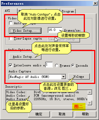 2、用“图一”的方法进入AVI的设置界面(见“图二”)。