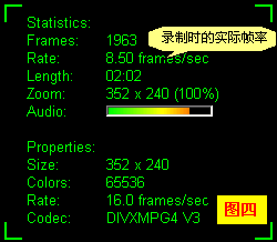其它各参数的含义依次如下:Frames:已录制的总帧数;Rate:当前实时的录制帧率;Length:已录制的影片长度;Zoom:缩放后(输出)的大小;Size:录制窗口的大小;Colors:录制图像的颜色数;Rate:输出文件的编码帧率;Codec:输出AVI文件的编码方式。